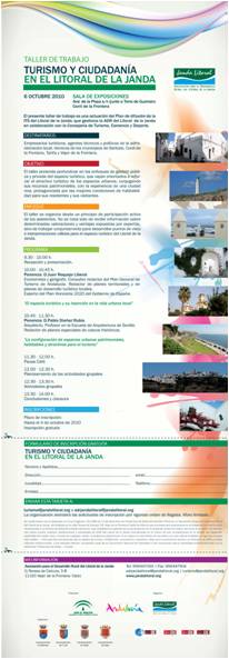 Lograr una mejor difusión y conocimiento del Programa de Turismo Sostenible de la Janda Litoral, tanto entre la población local como entre los visitantes, y, por tanto, facilitar la política de comunicación del mismo. Dar cumplimiento a la claúsula duodécima del Convenio de colaboración entre la Consejería de Turismo, Comercio y Deporte de la Junta de Andalucía y el Promotor Grupo de Desarrollo Rural del Litoral de la Janda para la realización del Programa de Turismo Sostenible de la Janda Litoral, firmado el 14 de diciembre de 2007, y relativa a la Difusión del Plan/Acciones de promoción y difusión. |